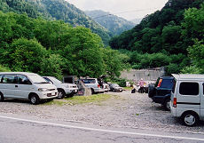 河原に向かって道なりに進むと、前方に砂防ダム、対岸に登山道が見えます。沢の流れはかなり急です。「渡るのかな?」と思っていたら答えはすぐに出ました。ダムの下にトンネルがあるのです。おもわず「へぇ〜!」でしたね。さて、ここから大谷原までの約55分間はつらい林道歩きです。林道は軽い下りの砂利道でした。ここで自転車が欲しいね。車がいいな。籠でもいいっすよ・・・。 |