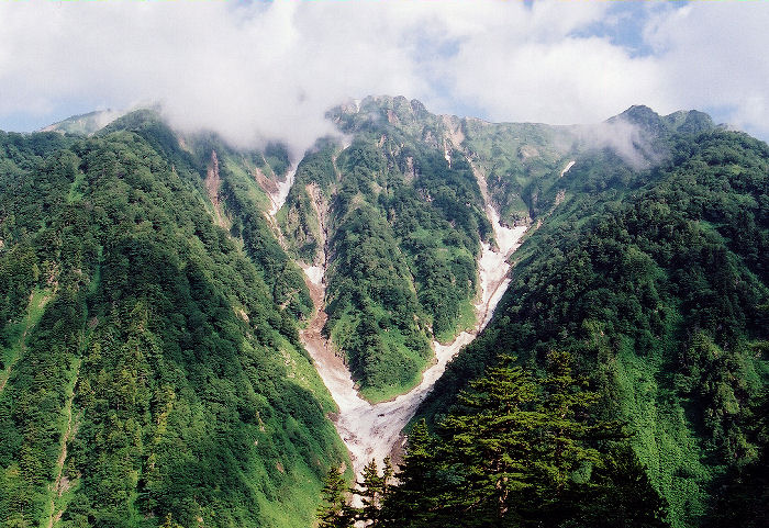 午前4時テント場出発。サブザックにカメラと雨具を入れ、ヘッドライトの明かりを頼りに鹿島槍ヶ岳へのピークハントに出かけます。テント場を出発してしばらくすると雪渓を2つ渡りました。早朝のため凍っており、ツルンツルンでした。正直怖かったです。(特に2つ目のが危なかったです。) 雪渓を過ぎてしばらくは、ほとんど水平移動です。木々の間を通り抜けると布引山の麓部分に出ます。このあたりでようやく前方に鹿島槍ヶ岳が見えます。 |
