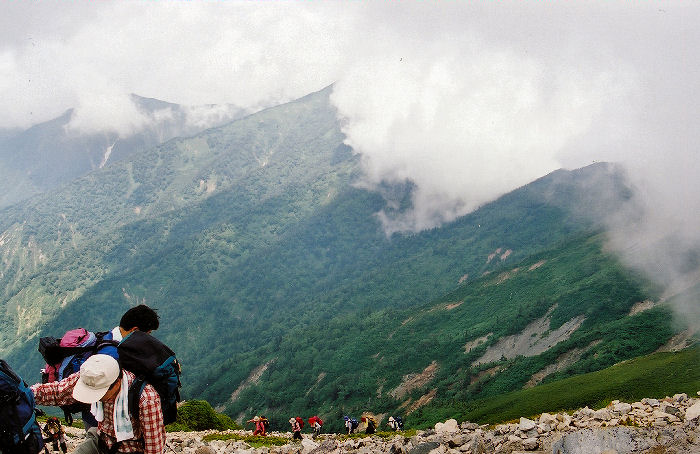 | 作者は南峰1番乗りに気をよくして、思う存分シャッターを切り、2番手の到着を待たずに冷池山荘へ再出発。途中ですれ違う人々に、「早いねー」と言われるのが気分よかったです!特に重荷で既に息が上がっている人を見ると、楽しくなっちゃいますね。(失礼失礼・・・) |