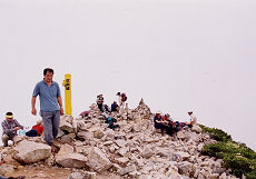 さて、鹿島槍ヶ岳への最後の登りもガレ場ジグザグでした。ピークが近づくにつれて当然のことですが登りがきつくなります。ただ、軽荷のうえ、これが最後の登りということもあり、楽しく登れました。そして、ついに鹿島槍ヶ岳頂上(南峰)到着!やったー!しかも1番だー!鹿島槍ヶ岳・南峰の頂上は、槍のように特別とがっている狭苦しい所ではなく、十分広かったです・・・。 |
