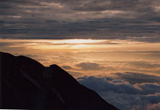 ここからはガレ場です。爺ヶ岳同様、ジグザグに登りながら高度を上げます。下界には後続者のヘッドライトがチラチラと揺れていました。どうやら作者が一番手のようです。さすがに軽荷だと足が速く、意外と簡単に布引山ピークに達しました。布引山の頂上付近はアップダウンが少なく、力を抜いて稜線歩きが楽しめます。布引山のピークを越え、鹿島槍へのちょっとした鞍部のあたりで日が昇り始めました。