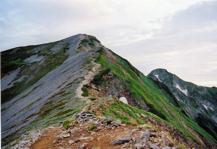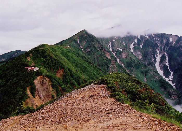 冷乗越では靴ひもをキッチリ締め直して再出発。冷乗越を出発して約5分程で、やせ尾根の危険箇所に入ります。ここは本当に危ないです。下りでは進行方向右が岩壁、左がガケで、歩行スペースは幅20〜30cmくらい。足場がもろく、今にも崩れ落ちそうでした。ストックは短く畳んでザックに固定するか、片手に持ったほうが良いです。危険箇所はワンポイントではなく右へ左へとカーブしながら約20分ほど続きます。 難所を通過した後は空の開けた岩稜の急坂(下り)となります。左手には鹿島槍ヶ岳の南峰・北峰が去りゆく作者を静かに見つめていました。 |