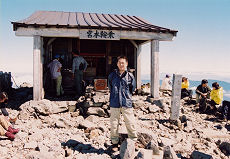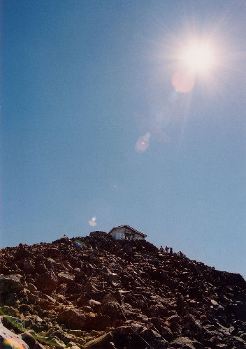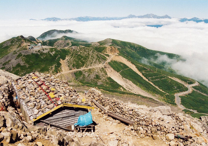 頂上直下には避難小屋のような頂上小屋(売店のみ)があります。作者とその一行が通ったときは開いているのかどうか分からなかったので、詳細は不明です。頂上には乗鞍本宮があり、御守りなどの土産を売っていました。なお、神社の正面は進行方向を向いているので、頂上に着いたら建物の左脇を通って正面に出ましょう。(けっして後面に向かってお参りしないでね。)