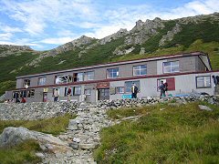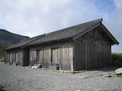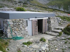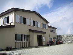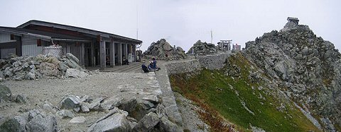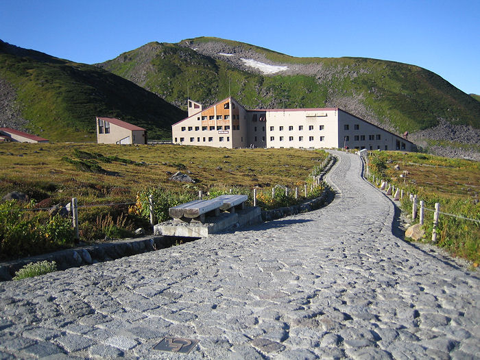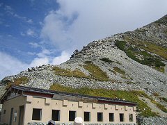 あまりにも寒い(外気温2.8℃)のでスタートを遅らせ、朝6時に剱沢のテント場を出発。剱山荘までは石ゴロの道。早朝の澄んだ空気を切り裂くようにテンポ良く移動すると約25分で剱山荘に到着。剱山荘は昨年度の豪雪で潰れてしまい、今年は休業して再建設中との事ですが、すでに外観はほぼ完成している模様でした。でも、本当にコレで大丈夫なのかな?
