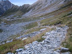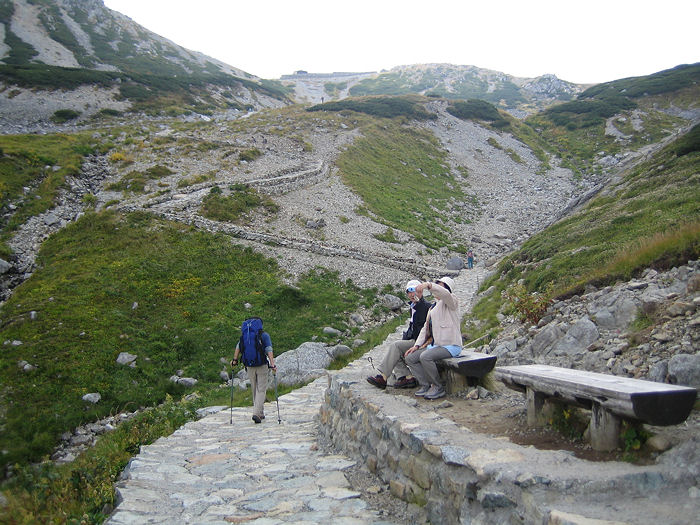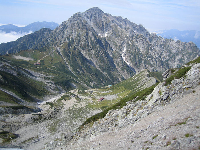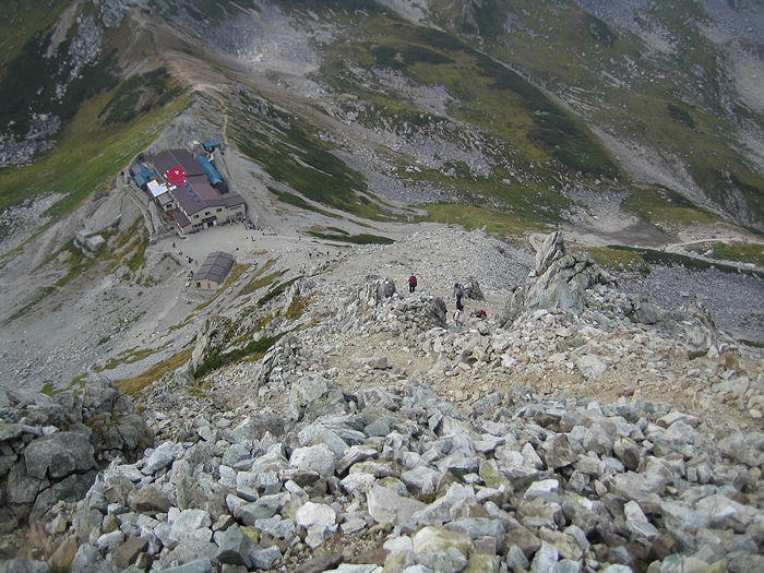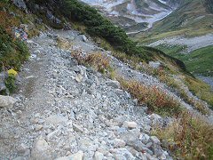平蔵の頭からはガレ場の急坂下りが続きます。もう危険箇所はありませんが、ずーっと下り坂。不安定な岩ゴロが疲れた膝に襲いかかります。ココで気を抜いて滑落する登山者も多いと言われます。ここが本当の試練と思い最後まで気を抜くことなく無事下山しましょう!なお、下山路では前剱のピークを踏むことなく巻き道から一服剱へ渡れます。ほんの少しは楽できるハズです・・・。