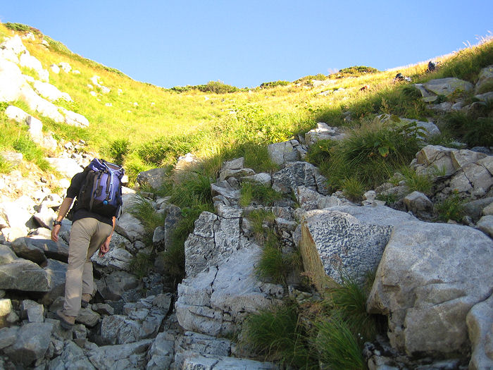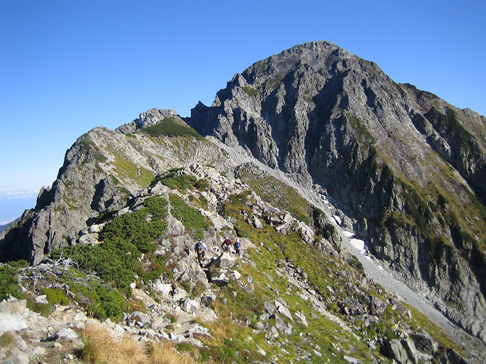 頂上を出発してしばらく下ると、正面に平蔵の頭と大岩壁が目に入ります。あの岩壁を下ってきたのかと思うと信じられない気がしますが、今度はアレを登るのです・・・。崩れやすいガレ場を慎重に下っていくと、下り専用コースに分かれたあと、右側に回り込むように降りるポイントが現れます。次の足場が見つかりにくく、ちょっと戸惑いますが、クサリを頼りに勇気を出して右下の足場に降りると、あとはクサリを持ちながら平行移動するだけで通過できます。ここがカニのヨコバイです。あれ?もうおわり?って感じで通過しちゃいました。