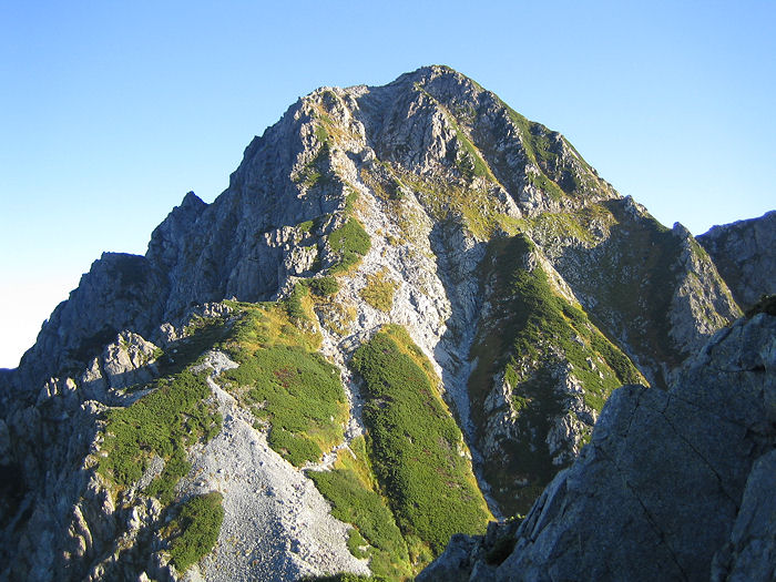 | 前剱に立つと、ようやく剱岳の猛々しい岩塊を目にすることができます。すごい迫力!でも、見えるのは岩壁だけで登山道らしきスジはほとんど見えません。まさかあの壁を登るのぉ〜? 答えはYES!さあさあ、レッツ・ゴーの前に一言。ここまで登って体力的あるいは技術的、精神的にもう限界という方はここで引き返しましょう!ここで剱岳を眺められただけでも頑張ったご褒美と受け止めてください。無理しないでくださいね。無事帰宅できる事が一番ですよ。