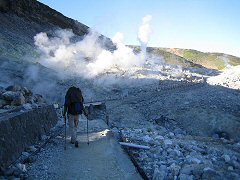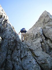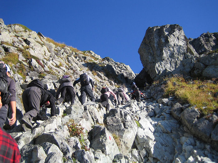 さあ、いよいよ次に登場するのは「カニのタテバイ」です! う〜ん、確かにほぼ垂直の岩壁登りで怖そうだし、手が滑ったらオシマイって感じですね。でも、がっちり渋滞していましたので、作者とのその一行はゆっくり見物してから挑戦しました。最初の3歩・4歩まではそうでもなかったですが、その後で左側へ移るあたりで足場が乏しくなり、ちょっと不安になります。それ以外は足場や持ち手が良いところにあって、どうにか登りきれました。焦ることなく、手足を滑らせなければ通過できますので、みなさんも頑張ってください。