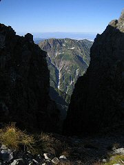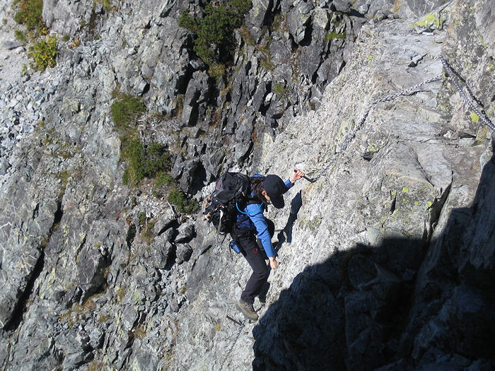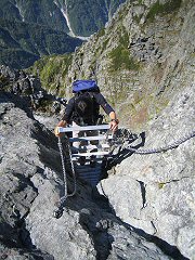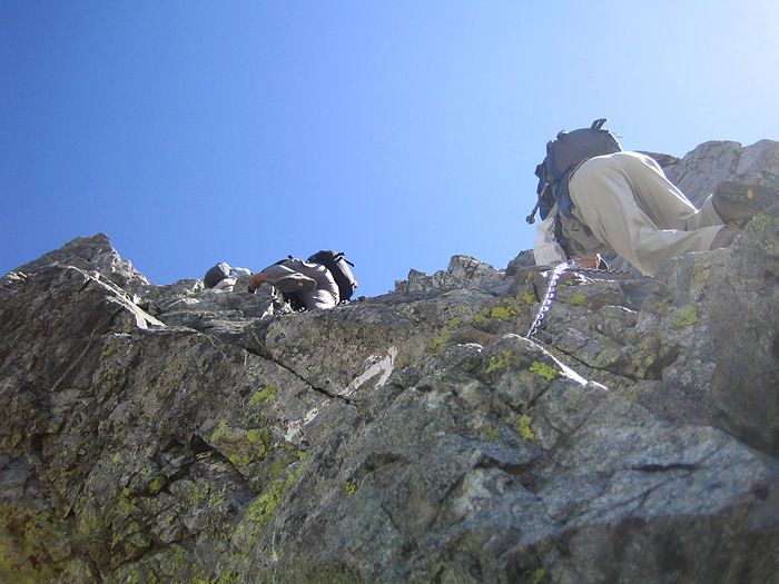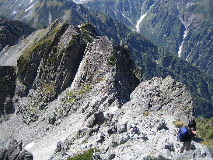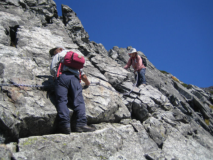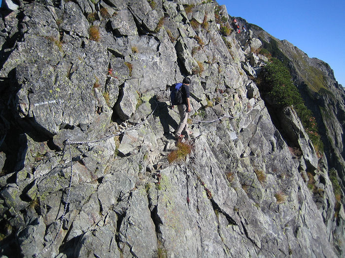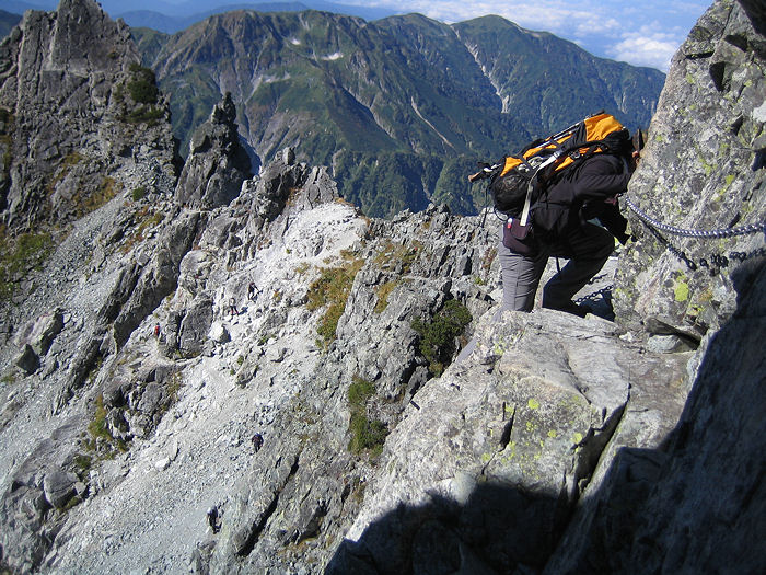 まずは、前剱のピークを出発してすぐに登場する「門」と呼ばれる岩棚のトラバース。小ピークの左脇を抜けて少し下ったあと、鉄製の渡り廊下(長さ3m弱)を渡りきると、岩面に沿って半時計方向に平行移動となります。岩棚と言ってもかなり足場が狭くなっていますので落ちないでね。もちろんクサリが付いていますので不安な方はシッカリつかまって通過してください。門を過ぎると次は壁面直降。クサリを頼りに、鞍部までほぼ垂直に降ります。
