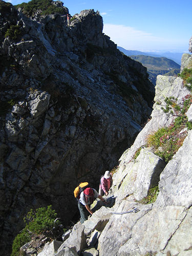 平蔵の頭では少し休憩しましょう。この先は作者が一番ビビッた岩壁下りです。平蔵の頭を出発すると少し平行移動した後、登りコース・下りコースに分かれます。登りコースは突き当った岩壁を右折です。(下りコースはその壁を降りてくる) 右折してチョット登ると、ありえない位の高さがある岩壁の上(写真の「平蔵の頭」参照)に出ます。いまからココを下ります。信じられません。鞍部まで約15m程。もちろんクサリが着いていますが、高さがあるだけにかなり怖かったです。(作者はココが一番怖かった〜) なんとか下りきると、その先が平蔵のコルとなります。