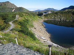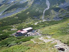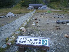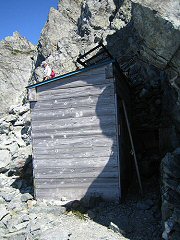 カニのヨコバイの次には今度は長〜いハシゴがあります。なかなか気を抜けないポイントだらけですが、このハシゴを下ると、またもや足場に困るクサリ場が現れます。慎重に降りましょう。下りきったら剱山荘〜剱岳間で唯一のトイレがあります。トイレを通過すると、登り用コース(カニのタテバイ方面)との分岐点=平蔵のコルに出ます。登りでは分岐があった事は気が付かなかったですね。カニタテばっかり見てたのかな・・・。
