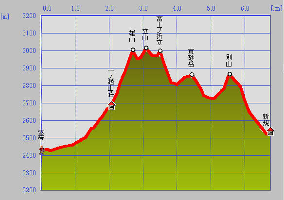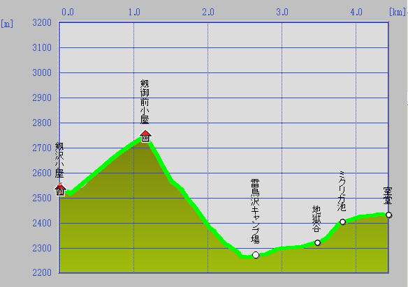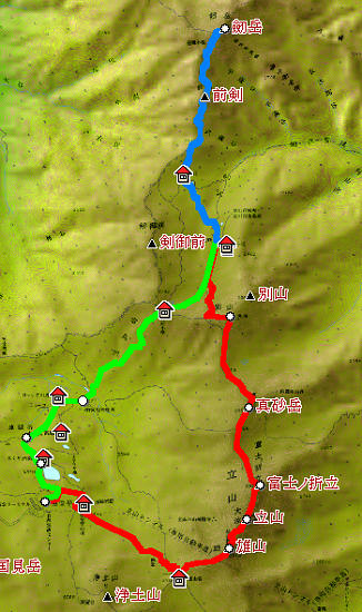 | 剱岳〜平蔵のコル〜一服剱〜剱沢小屋=約35分+約70分+約60分 |