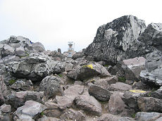 頂上には那須岳神社があります。周囲は岩で囲まれております。頂上部は、すり鉢状に窪んだ噴火口?の周りを一周できます。作者とその一行は・・・怖いので、写真を撮ってサッサと逃げました。 |