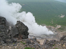 峰の茶屋からは火山岩のガレ道となります。硫黄のニオイがきつく、吹き出す噴煙(水蒸気?)にビビリながら茶臼岳を目指します。