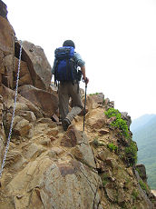 いったん峰の茶屋に戻って、今度は朝日岳方面へ歩きだすと、クサリ場が現れます。あまり怖さはないので、慎重に進めば大丈夫。登山道はクサリ場を抜け、急坂を登りきると朝日岳と清水平方面との分岐点(朝日岳分岐)に出ます。朝日岳は進行方向右です。