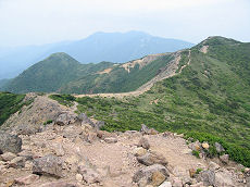 峠の茶屋を出発して15分ほどで樹林を抜けます。視界がいっきに開け、登山道は軽いガレ道となります。はじめは歩きにくさを感じますが、登るに連れて足場が良くなります。(一歩一歩の着地点が決めやすくなる) 峰の茶屋が近づくに連れ、右手の朝日岳(写真)が大きく迫ってきます。登山道は依然ガレ場ですが、展望が良く気持ちイイ。 |