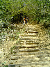 登山道は「整備してある登山道」の象徴と言うべき「丸太階段」が途中にいくつも現れます。作者とその一行は、例によって歩幅のあわない丸太階段に苦しめられながら、せっせと急坂をのぼりました。さらに酷な事にケーブルカー頂上駅間近となると丸太階段が長蛇のように続くのです。もう勘弁してチョ〜。 |