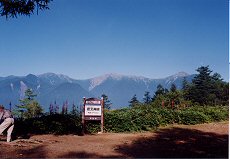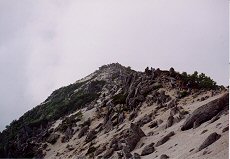 薬師岳頂上は砂礫の地面の上に花崗岩がポツリ、ポツリと置いてあるような所で、独特な雰囲気を醸(かも)し出しております。この山頂からは富士山や北岳の眺めが最高のはず。(作者一行が付いたときは曇っていたのでした。)