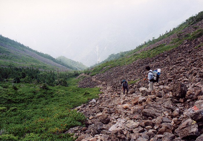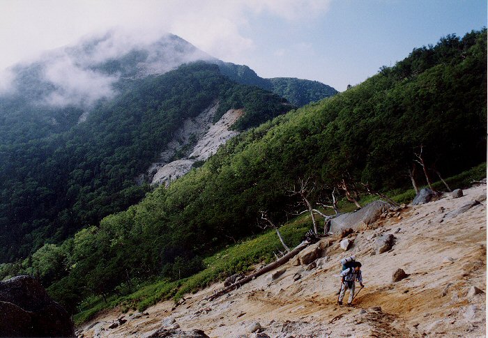 白鳳峠はT字路となっており、直進は広河原峠、左折は広河原となります。小休憩の後、広河原に向けて出発。樹林は出発早々になくなり、石ゴロの谷部を下ります。「よくもこんなに石があったもんだ」と感動するくらい石ばっかりの道です。この石ゴロを約30分も下ると、うっそうとした最後の樹林に入ります。