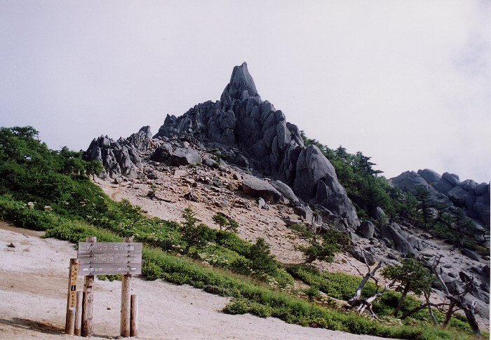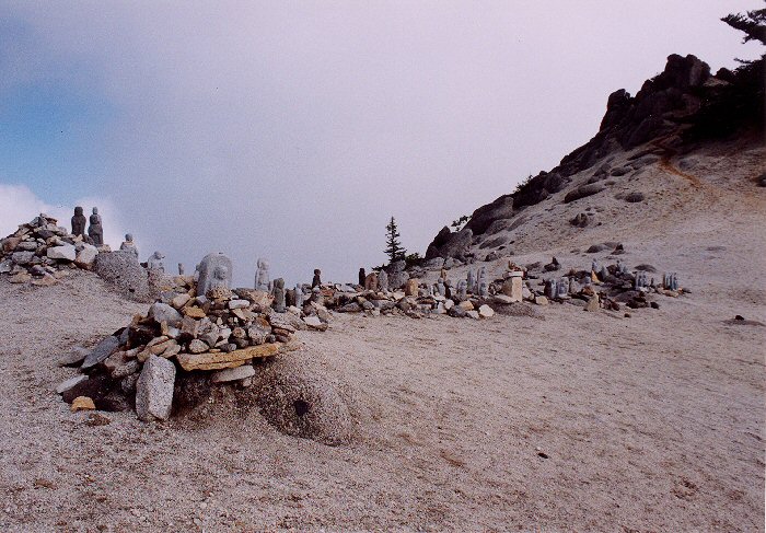 ようやくオベリスク直下に到着。圧倒的な迫力でそびえ立つオベリスク!感動です。なんでこんなものがあるの?ホントに自然に出来たの?という感じです。オベリスクから少し離れた鞍部にお地蔵さんが並んだ賽の河原があります。悪天時は強烈な風が吹き抜けそうな鞍部ですが、ここのお地蔵さんは「子宝に恵まれるように」というものらしいです。