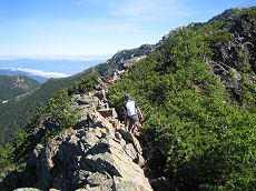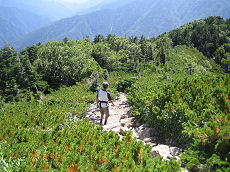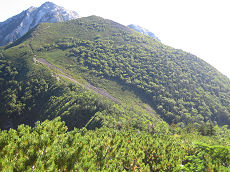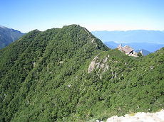 登山道は北沢峠バス停にある長衛荘の右手より始まります。双児山の直下までは樹林。急登という程でもなく、整備されていて登りやすい道でした。北沢峠を出発して約1時間15分、樹林を抜けると双児山まで短いハイマツ帯歩きとなります。 |