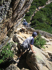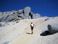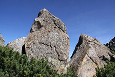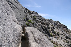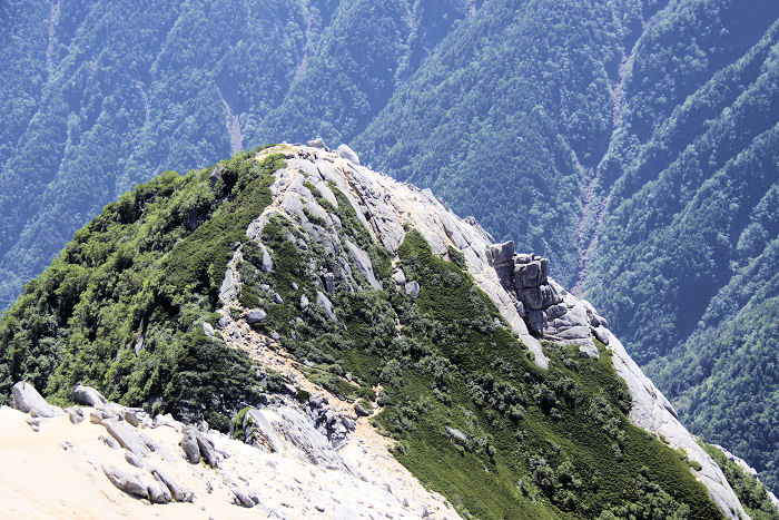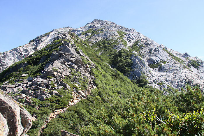 下りが落ち着くとまもなく六方石。倒れてきそうな巨岩の脇を抜けると、いよいよ甲斐駒本体への取り付きとなります。ここから頂上までは砂礫の急登。花崗岩の照り返しで目がチカチカしますので、サングラスがあった方が良いですよ。 |