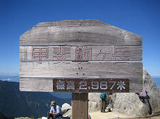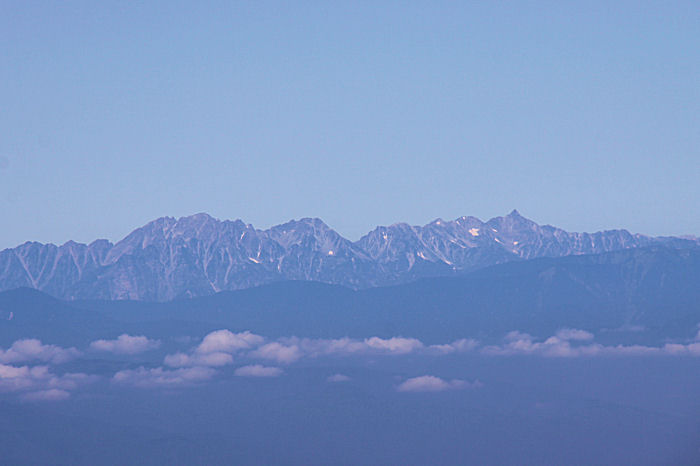 広い頂上部は登山者で賑わっていました。360℃の大パノラマは言うまでもありませんが、この日は天気が最高に良く、北アルプスの白馬岳〜乗鞍岳まで望むことができました。 |