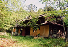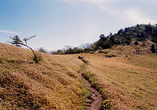 ロッジ長兵衛を歩き出してまもなく大菩薩館跡(廃屋)があります。破れた障子や畳などが剥きだしで、昼間でも怖そうです。登山道はここから約1時間半の間、樹林帯となります。途中、車道渡り2回と沢渡り1回があります。樹林の急坂を登りきると、なだらかなクマザサの草原が出現して、まもなく石丸峠となります。