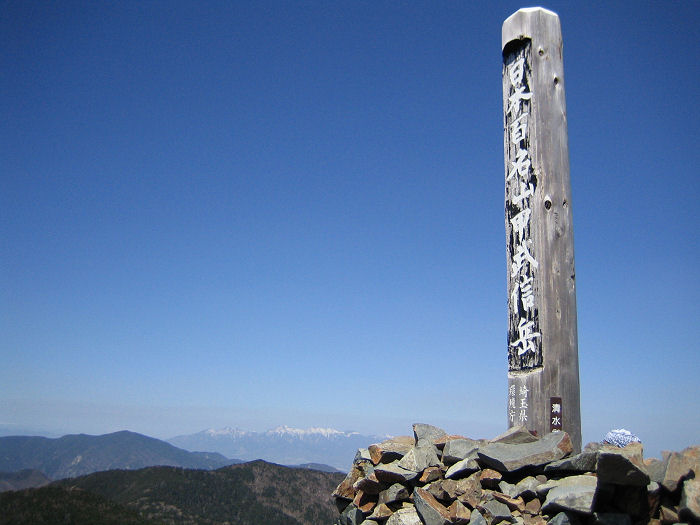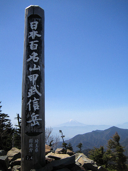 甲武信岳の頂上目前となった付近でようやく雪が無くなりました。結局最後までアイゼン無しで登れました。甲武信岳の頂上には「日本百名山甲武信岳」の標が立っています。展望は期待どおりにすばらしく、八ヶ岳、金峰山、南アルプスに富士山を望めました。 |