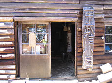 甲武信小屋は丸太で組んだごく一般的な山小屋(雲取山荘も昔はこんな風だった)。ただ、玄関前にウッドデッキがあり、そこにおかれたテーブル&椅子でくつろげます。噂に聞いた甲武信小屋の看板娘さんは、噂どおりかなりイケてます。トイレはチップ制で、手作りの男子用便器?が特徴的でした。 |