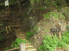 堂平分岐から、少しの間は緩やか道です。新緑に輝く樹木の間を登山道がS字に抜けていく風景はホントにキレイです。分岐から、15分ほどではじめての注意ポイントが現れます。クサリもあります。進行方向右側が崩落しており、登山道についた階段が今にも崩れ落ちそうな崖っぷちを登ります。注意して進みましょう。