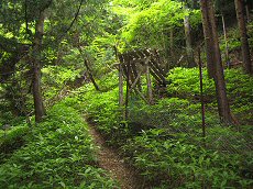 本谷橋を出発して、少し登るといきなり登山道が無くなります・・・。実は登山道の続きは右手のシカ避けのフェンスの向こう側にあるのですが、作者は始めて見ましたが、最初は登山道の続きが分からず真剣に悩みました。だってフェンスには扉があるけど針金で固定されているので、向こう側に行っては行けないという意味かと思ったんだもん。ちなみに、シカ避けフェンスの通過はフェンス脇の展望台のような足場を渡って進みます。