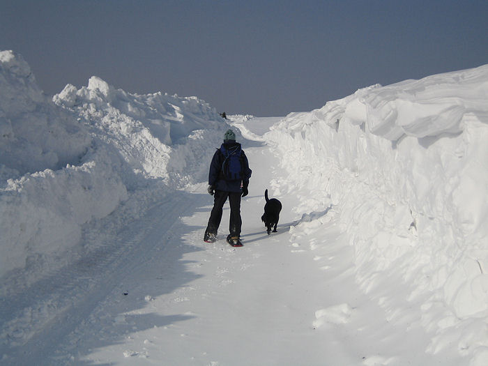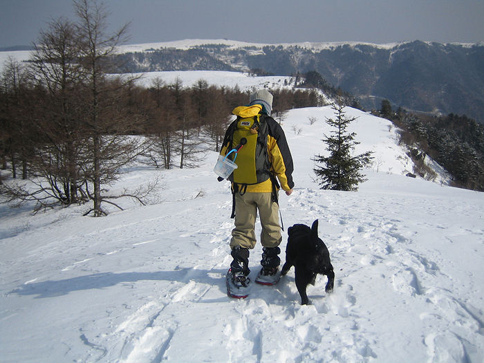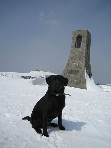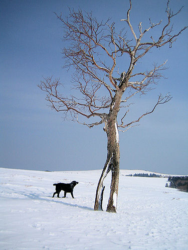 途中にあった一本木でのヒトコマ。黒ラブ(注)最高! |