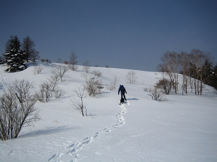 美ヶ原高原ホテルを過ぎると一面大雪原に出ます。登山道やトレースがあるのかどうかよく分からなかったですが、前方左手に目的地の茶臼山(写真)が見えてますので、一直線に進むことに・・・。 |